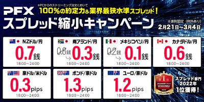 株式会社 マネーパートナーズ(代表取締役社長:福島秀治、本社:東京都港区、以下「当社」)では、パートナーズFXで人気の「米ドル/円」をはじめとする4通貨ペアで、業界最狭水準のスプレッド縮小キャンペーンを3月も継続いたします。