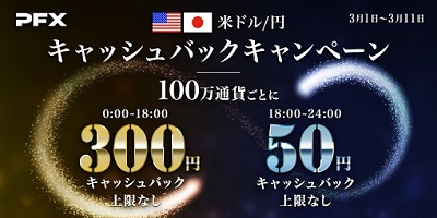 これまでと同様に0時~18時は、100万通貨ごとに300円キャッシュバックいたします。さらに、業界最狭水準スプレッドに縮小する18時~24時においても、100万通貨ごとに50円キャッシュバックいたします。