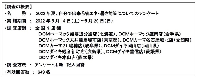 そこで、ホームセンターのD CM 株式会社(本社:東京都品川区、代表取締役社長:石黒靖規、以下、DCMは、「自分で出来る省エネ・暑さ対策」をテーマに 店舗をご利用のお客さまに アンケート調査を行いました。ここに、調査結果の概要をお知らせします 。