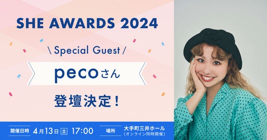 学ぶから働くまでをサポートする女性向けキャリアスクール「SHElikes(シーライクス)」を運営するSHE株式会社(所在地:東京都港区、代表取締役CEO/CCO:福田恵里 以下、SHE)が4月13日(土)に開催する「SHE AWARDS 2024」のスペシャルゲストに、タレント/ブランドプロデューサーのpecoさんの登壇が決定しました。