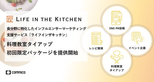 株式会社ラバブルマーケティンググループ(本社:東京都港区、代表取締役社長:林 雅之、証券コード:9254)の子会社で、企業のSNSマーケティングを支援する株式会社コムニコ(本社:東京都港区、代表取締役:長谷川 直紀、以下 コムニコ)は、食分野に特化したインフルエンサーマーケティング支援サービス「Life in the Kitchen(ライフインザキッチン)」において、初めて導入いただくお客様を対象に、初回限定価格で料理教室タイアップとSNS活用の商品訴求が行えるパッケージプランを提供いたします。