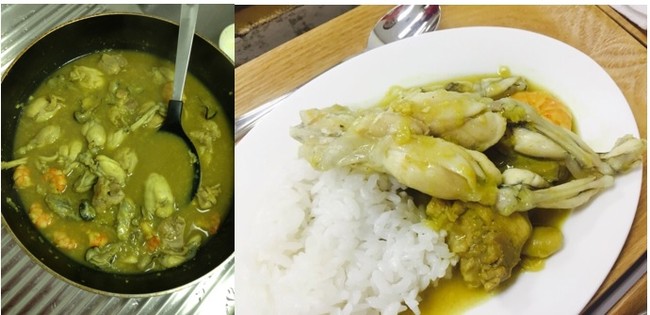 カエルをメイン具材に使い、長ネギとC&Bカレー粉などで作る明治5年のカレーが楽しめる。