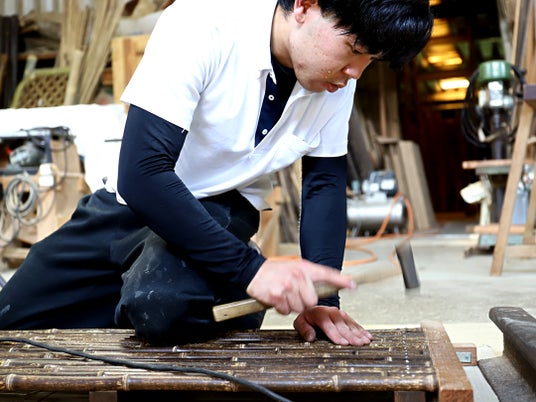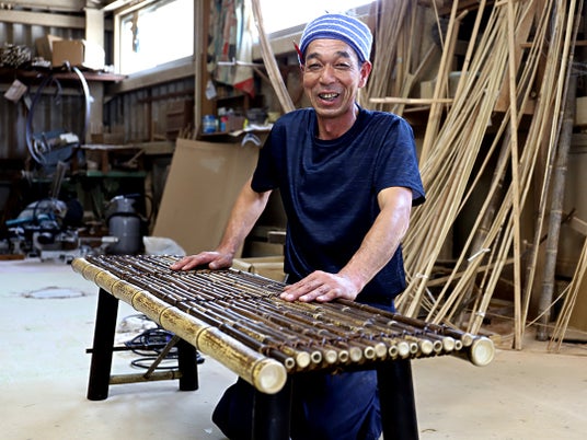 今回認定された「虎竹縁台」は、高知県須崎市安和地区特産の虎斑竹(とらふだけ)を素材に使用しています。虎斑竹は、その名の通り竹表面に虎模様のような独特の斑紋が浮かぶ個性豊かな竹であり、土佐藩政時代には、年貢としても献上されていました。竹虎では、この竹を一本一本厳選し、長年培ってきた竹加工技術を生かして、熟練の職人が丁寧に縁台へと仕上げています。
