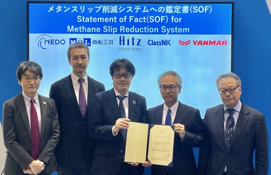 日立造船株式会社(以下、日立造船)、株式会社商船三井(以下、商船三井)とヤンマーパワーテクノロジー株式会社(以下、ヤンマーPT)は、国立研究開発法人新エネルギー・産業技術総合開発機構(以下、NEDO)によるグリーンイノベーション基金事業「次世代船舶の開発」プロジェクトで採択された「触媒とエンジン改良によるLNG燃料船からのメタンスリップ※1削減技術の開発(以下、本事業)」において、陸上試験にて削減率93.8%(エンジン負荷率100%時)を達成し、この度、一般財団法人日本海事協会(坂下 広朗会長、以下、NK)より削減率達成の確認を証明する鑑定書を世界で初めて取得しました。
