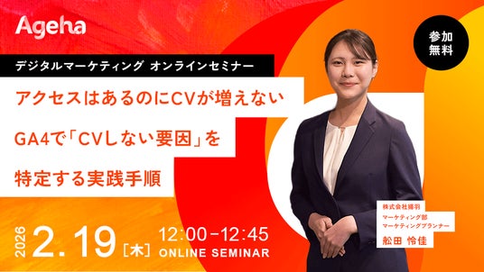 コーポレートブランディング支援を行う株式会社揚羽(東京都中央区 代表取締役社長:湊 剛宏 証券コード:9330)は、2026年2月19日(木)に「アクセスはあるのにCVが増えない、GA4で『CVしない要因』を特定する実践手順」と題したセミナーを、オンラインで開催します。