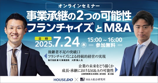 この度、フランチャイズチェーン「HOUSE DO(ハウスドゥ)」を運営するハウスドゥ住宅販売様とウェビナーを開催いたします。同社は不動産売買仲介を中心に、買取再販、リフォーム、金融サービスなどを手掛ける総合不動産企業です。同社のフランチャイズ事業は全国725店舗(2025年6月末時点)を展開し、不動産売買仲介専門FCとして業界No.1の規模を誇ります。不動産業界の後継者不在でお悩みの経営者様に向け、FC加盟を通じた事業承継とM&Aの2つの選択肢について解説いたします。