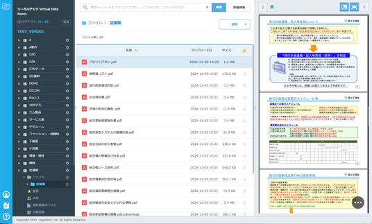「リーガルテックVDR 空運業」は、特に機密性の高いデータ共有や法務関連のプロセスをサポートするために、以下のような具体的な機能を備えています。これらの機能は、空運業界やその他の産業でも利用されるため、データ管理とセキュリティの向上に役立ちます。