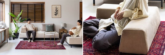 従来のソファのイメージでは、アームは両端に固定されているものという概念がありました。しかし、「もう少しこちらに寄せられたら」「反対側にも欲しい」といったご要望にお応えし、このL字クッションはお好みの位置に自由に移動させることができます。カウチスタイルで足を伸ばすときも、L字型に座るときも、クッションを最適な位置に配置することで、より快適なくつろぎ時間をお過ごしいただけます。
