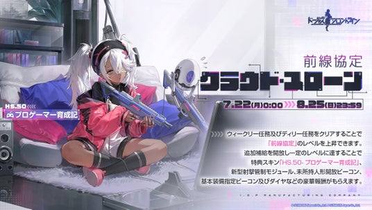 ウィークリー任務とデイリー任務をクリアすることで「前線協定」のレベルが上昇し、新型射撃管制モジュールや未所持人形解放ビーコンなどの豪華報酬がもらえる『前線協定 クラウド・スローン』を「7月22日(月)0:00」より開催します。