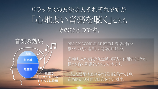 アプリRELAX WORLD MUSICは、音楽の持つ癒やしの力に着目して開発されました。