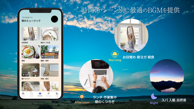 「お目覚め」「ランチ」「夜のくつろぎ」「作業・集中」など、時間帯・シーン別に最適のBGMを提供。