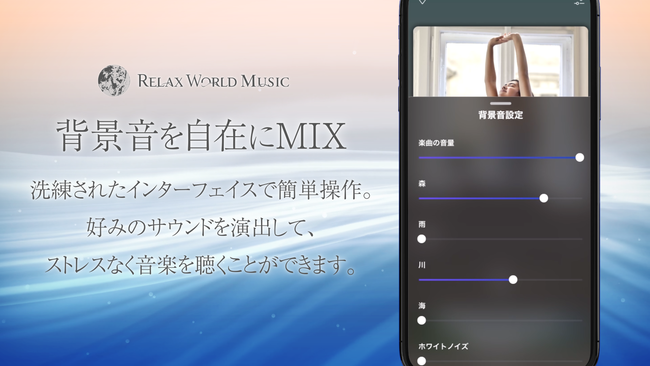 アプリRELAX WORLD MUSICは、医学博士や音楽療法士が監修した音源をはじめ、癒しと眠りをもたらす様々な種類の音楽を提供し、あなたの一日をトータルでサポート。