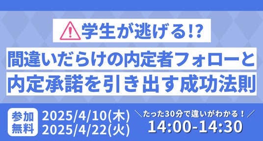 ◆多くの企業が考える、誤った「内定者フォローの常識」◆「自社が滑り止めにされている…」「ちゃんとフォローしてるのに学生が離れていく…」 こんな悩み、ありませんか?実は、内定者フォローのやり方を間違えると逆に学生の不安を煽って辞退を加速させてしまうことも…このセミナーでは、学生が辞退する本当の理由を事例をもとに解説。企業がやりがちな「学生が離れるフォロー」と、「学生が決断したくなるフォロー」の違いをお伝えします。さらに、内定承諾率を上げるために企業がやるべき「たった1つの重要なアクション」も大公開!LINEやSNSを使った最新のフォロー方法など、すぐに実践できるノウハウをお届けします。