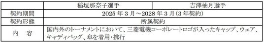 プロ2年目でこれからの活躍が期待される両選手は、今後、当社所属選手として三菱電機コーポレートロゴが入ったキャップやウェアなどを着用し、国内外のトーナメントに出場する予定です。