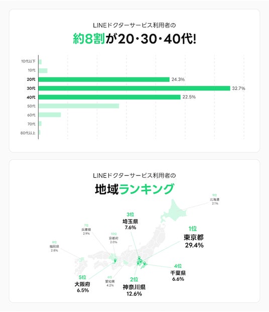 サービス利用者の年代は30代が最も多く32%以上となりました。20代~40代までの世代にボリュームゾーンが存在し、忙しい社会人に使っていただいているサービスであることがわかります。また、「LINEドクター」の主な利用者の地域は都市圏が中心ですが、全国でも利用いただいており遠隔医療サービスとしての一面がうかがえます。