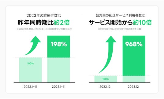 「LINEドクター」の診療件数は2022年と比較し、前年比約2倍増となりました。特に花粉症時期にあたる2023年3月は前年比約3倍に増加、新型コロナウイルスが5類感染症に移行後も8月をピークに診療が拡大するなど、多くのユーザーにとって身近な診療手段として利用されてきています。また、処方薬の配送サービス利用者数はサービスを開始した2022年12月と比較し、2023年12月には約10倍に成長しました。
