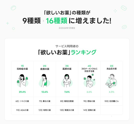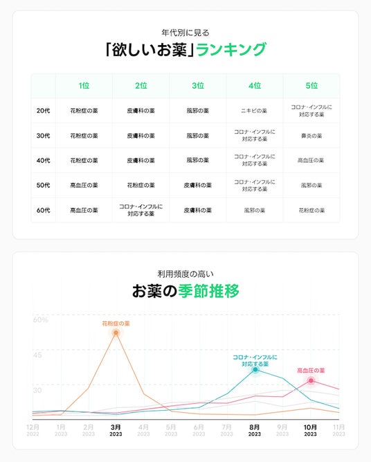 「LINEドクター」にて提供する処方薬は当初の9種類から2024年1月時点で16種類に拡大しました。そのなかでも、花粉症の処方薬に最も需要が集まりました。また、8月から9月にかけてはコロナ・インフルに対応する薬や、風邪の薬への需要が高くなりました。年代別では全世代に皮膚科の薬への需要が見られるほか、50代以降では高血圧の薬が最も需要を集めました。