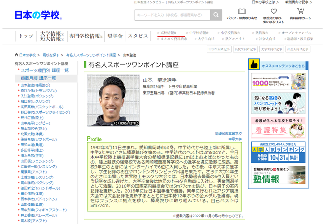 全国の大学・短大・専門学校などの学校情報を提供する、株式会社JSコーポレーション(本社:大阪市北区 代表取締役社長:米田英一)は、スポーツワンポイント講座「棒高跳び/山本聖途選手」(https://school.js88.com/scl_h/onepoint-advice/sport?item=33&athlete=203)」を公開しました。