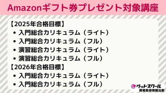 「グッドスクール・資格情報比較」より、上記の講座をお申し込みいただいた方全員に5,000円分のAmazonギフト券をプレゼントいたします。
