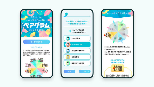 恋愛心理学に基づく質問への回答から、恋愛で重要な4つの感覚(行動・思考・許容・利他)が感じ取れることで相手の人柄がわかる新機能ペアーズクエスチョンを体験できる無料ウェブコンテンツ「ペアグラム」を12月23日から提供します。本コンテンツは、ペアーズへの登録不要でどなたでもお楽しみいただけるもので、「今日もらった100万円、どう使う?」などの質問に回答すると、恋愛においてどのような性質を持つ相手に魅力を感じるかを知ることができます。