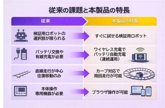 本製品は、レール上を走行するロボットとワイヤレス充電、RFID制御、Wi-Fi通信機能を一体化し、自動化の検証・評価を簡単に行うためのシステムです。