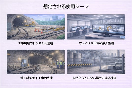 レールロボットの活用により、工事現場やトンネル、地下施設などでの監視・点検用途が想定されます。また、オフィスや工場における巡回確認や、人が立ち入りにくい場所での遠隔監視などへの応用も期待されます。