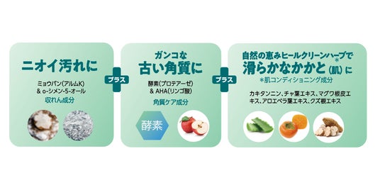 ニオイ汚れにミョウバン(アルムK)&o-シメン-5オール配合(※2)。頑固な古い角質に酵素(プロテアーゼ)&AHA(リンゴ酸)配合(※3)。滑らかなかかとに自然の恵みヒールクリーンハーブ カキタンニン、チャ葉エキス、マグワ根皮エキス、アロエベラ葉エキス、クズ根エキス配合(※4)。