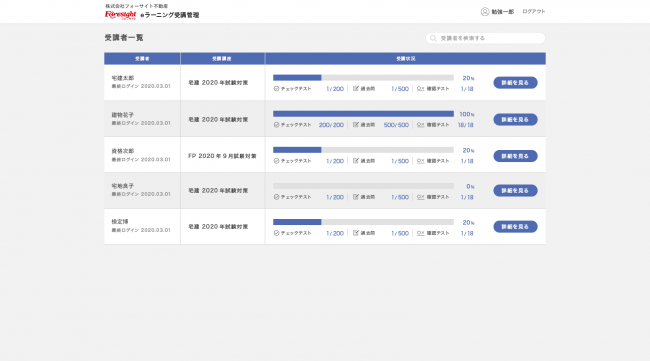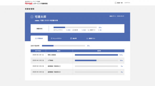 受講生には、フォーサイトがお届けしているテキストや問題集などのほか、受講生の方へはスマホなどで勉強ができるeラーニングも提供します。「eラーニング受講管理システム」では、受講生のeラーニングでの学習状況をご確認いただけます。
