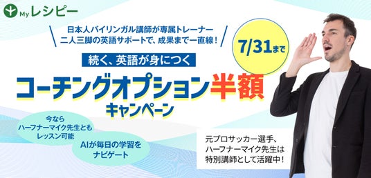 株式会社ポリグロッツ(本社:東京都新宿区、代表取締役:山口隼也)は、7月16日(火)から7月31日(水)までの期間、コーチングオプション半額キャンペーンを開催いたします。期間中、パーソナルレシピ型英会話のコーチングオプションを半額でご提供いたします。この機会をぜひご活用いただき、英語学習を強化してください。