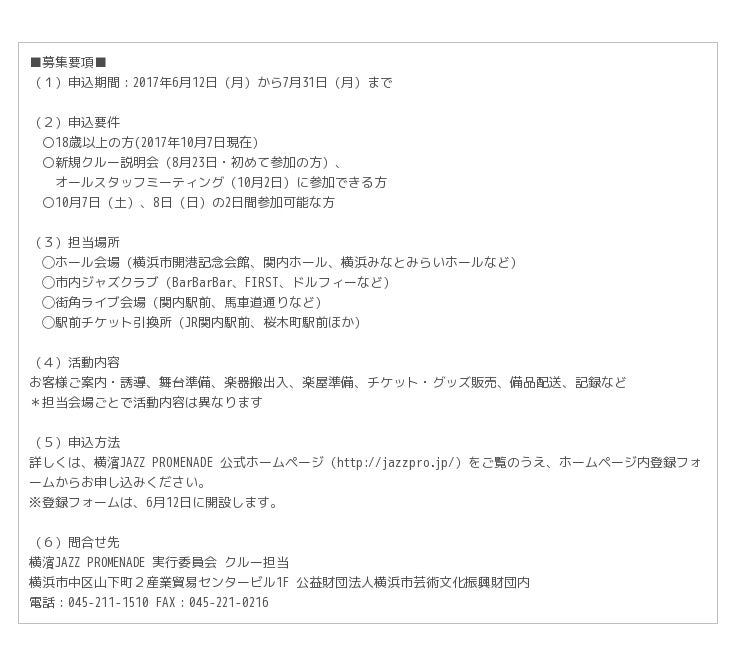 2017年10月7日(土)、8日(日)の2日間、港町ヨコハマが誇る日本最大級のジャズフェスティバルの運営に携わるボランティアスタッフを募集します。