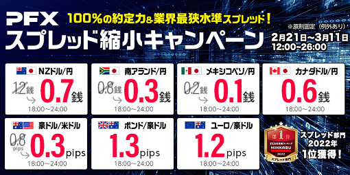 株式会社 マネーパートナーズ(代表取締役社長:福島秀治、本社:東京都港区、以下「当社」)は、2月21日より「パートナーズFX」で実施している「NZドル/円」など人気の7通貨ペアを、業界最狭水準のスプレッドに縮小するキャンペーンにつきまして、3月11日までキャンペーン期間の延長を決定いたしました。