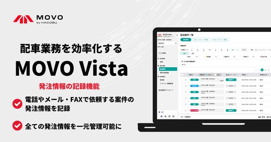 データの力で物流課題を解決する株式会社Hacobu(ハコブ、本社:東京都港区、代表取締役社長CEO 佐々木太郎、以下「Hacobu」)は、配送案件管理サービス「MOVO Vista (ムーボ・ヴィスタ)」に、発注情報の記録機能を実装いたしました。協力会社へ電話やメール・FAXを使って依頼する案件の発注情報を、MOVO Vista内に記録できるようになります。これにより、導入企業は全ての発注情報をMOVO Vistaで一元管理することが可能となります。
