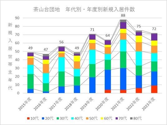 公社では泉北ニュータウンの茶山台団地(堺市南区)をリーディングプロジェクト団地と位置付け、住民の高齢化や空家の増加に伴う地域コミュニティの衰退といった課題解決を図るため、2015年より団地再生に取り組んでいます。その一環として、パートナー事業者と協働し、空き部屋を活用した複数のコミュニティ拠点を作り、地域のまちづくりに取り組んできました。これらの取り組みの成果により、30代以下の新規入居者数が増加し、空家率が2015年度末の約17%から2023年度末は約8%になるなどの効果が表れています。