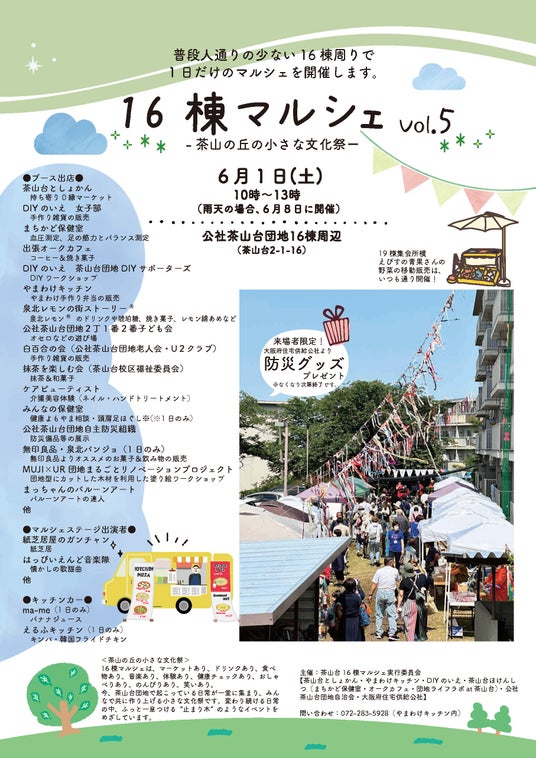 大阪府内において公社賃貸住宅SMALIO(スマリオ)を提供する大阪府住宅供給公社(本社:大阪市中央区、理事長:山本 讓、「以下、公社」)は、2024年6月1日(土)に茶山台団地(堺市南区)において、住民やコミュニティ支援事業を手がけるパートナー事業者と共に作る1日だけの小さなマルシェ『16棟マルシェ~茶山の丘の小さな文化祭~』を開催することをお知らせします。