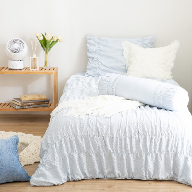 リップル加工を施した生地を使用したシャリ感のあるギャザーが涼やかで爽やかなデザインのシリーズです。肌に触れる裏地には自然なひんやり感のあるレーヨン素材を使用しているので気持ちの良い肌触りを楽しめます。2022年モデルは、マットレスをしっかり隠せるベッドパッドと、全面に施されたギャザーで華やかになったまくらカバーで、より素敵なベッドメイクをお楽しみいただけます。
