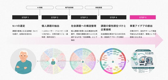 「N=1の選定→個人課題の抽出→社会課題への構造整理→課題の優先順位づけと企業接続→事業アイデア創出」の5つのステップを通して、戦略的なアイデアを創出するフレームワークによる一連のプロセスを体験いただけます。