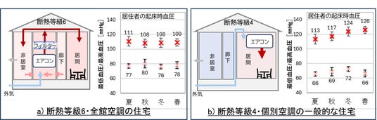 本研究では、断熱性能や空調方式の異なる4世帯(計8名)を対象に、2024年7月から2025年6月までの1年間、室温・湿度、血圧、体表面温度などを測定し、季節変動や起床時の血圧変化との関連を調査しました。その結果、部屋ごとに空調する一般的な住宅では、秋季や冬季に室温が18℃を下回る時間帯があり、血圧が上昇するケースが見られました。一方、全館空調を備えた高断熱住宅では室温が安定し、血圧の季節変動が小さい傾向が確認されました。また、冬によく観察される起床時の血圧上昇は、寝床内と室内の温度差が大きいことで、起床時に体表面の温度が急激に下がることと関係しており、寝床内温度と室温の差が小さい住宅では、朝の血圧変動を抑えられる可能性が示唆されました。