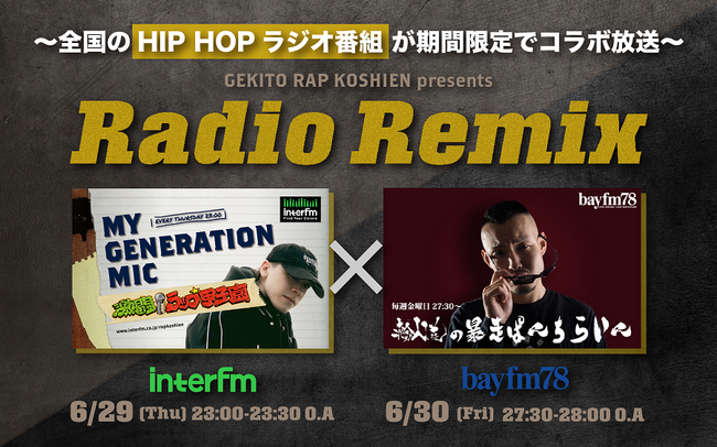 interfm(TOKYO:89.7MHz)で、毎週木曜日23:00-23:30に放送「MY GENERATION MIC -激闘!ラップ甲子園 -」が、全国のHIPHOPラジオ番組と繋がり、期間限定でコラボレーション放送することが決定致しました。