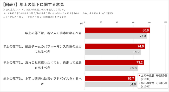 年上の部下に関する意見を、年下の上司、年上の部下、両者にききました。年下の上司の回答では「若い人の手本となるべき」80.8%、「所属チームのパフォーマンス発揮の主力となるべき」74.6%、「あれこれ指導しなくても、自走して成果を出すべき」73.2%、「上司に適切な助言やアドバイスをするべき」62.7%と、いずれも高い傾向となりました。年上の部下の回答でも、同様の傾向を示しており、上司部下ともに、年上の部下への期待がみられる結果となりました【図表7】。