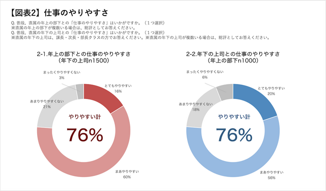 年下の上司に対しては、年上の部下との「仕事のやりやすさ」を、年上の部下に対しては、年下の上司との「仕事のやりやすさ」を聞きました。結果、ともに76%が「やりやすい」と回答しました【図表2】。