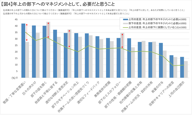 一方、マネジメントされる側となる年上の部下側では、「部下の話を聞く」が43.2%と最多になりました。次いで、「適切な判断と意思決定」「部下のミスのフォロー」といった「適切な関与」が、マネジメントに必要という意見が上位となりました。これに、年下の上司が「年上の部下に実際にしていること」とした回答結果を重ねると、いずれも10%以上の差が見られ、実態が追いついていない様子がうかがえます【図表4】。
