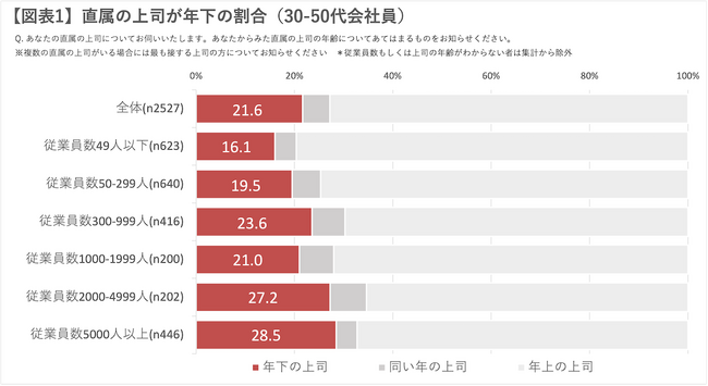 現在、30-50代会社員のうち、「直属の上司が年下」である人は約20%。従業員数2000人以上の大企業では、30%近くに達しています【図表1】。今後、年功序列から成果主義へのシフト、定年の延長によるシニア社員の増加などで、上司が年下であるケースはさらに増える可能性があります。サイボウズチームワーク総研では、「年下の上司」と「年上の部下」との関わりを調べ、マネジメント支援のための視点を探りました。