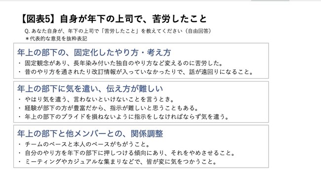 年下の上司に対し、「自身が年下の上司で、苦労したこと」を自由回答で聞いたところ、「年上の部下の固定化したやり方・考え方」「年上の部下に気を遣い、伝え方が難しい」「年上の部下と他メンバーとの、関係調整」といった意見が見られました【図表5】。