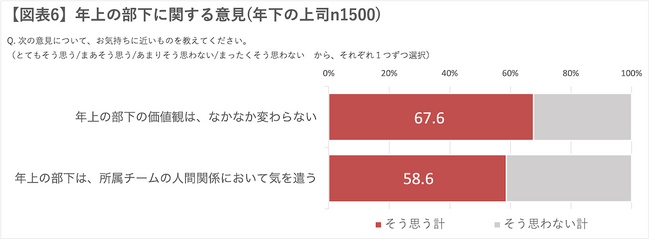 また、「年上の部下の価値観は、なかなか変わらない」「年上の部下は、所属チームの人間関係に置いて気を遣う」という意見について、年下の上司の過半数が「そう思う」と回答しました【図表6】。