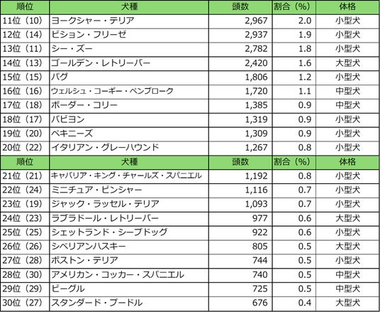 「ヨークシャー・テリア(11位、2,967頭)」や「ビション・フリーゼ(12位、2,937頭)」、「シー・ズー(13位、2,782頭)」など、小型犬が続いています。