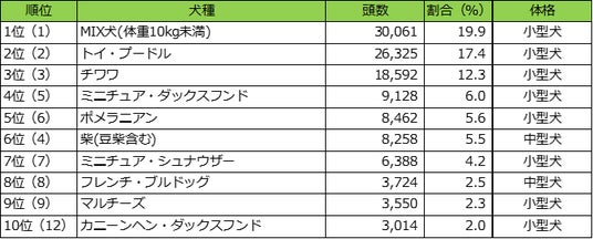 集計の結果、「MIX犬(体重10kg未満)」が30,061頭で2年連続の1位となりました。