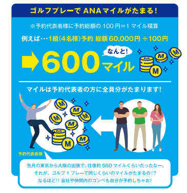 2. ゴルフプレー代金のお支払いで予約代表者様に同行者様含めた全員分の予約総額に対し100円=1マイルが積算されます。複数組のコンペを予約されるお客様にもおすすめです。