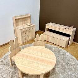 島根県産ヒノキ材で製作した、子どもが遊ばなくなった後でも使用できる「ままごとキッチン」を出展。コンロのつまみを回せばカチカチ音が鳴り、収納ベンチに座りながらままごと遊びができます。子どもが遊ばなくなった後はコンロのつまみ部分を引っ張り出し、前後をひっくり返せば引き出しになり、収納ベンチを奥まで入れることでテレビボードなどとして活用できます。