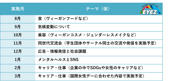 毎月異なるテーマに沿ったディスカッションやワーク、登壇者へのQ&Aを通じ、「社会課題に対して向き合うスタンス」と「具体的なアクション」を考えていきます。SHIBUYA109 lab. EYEZ4期メンバー以外の学生や企業も参加し、様々な人が理解を深められる場を目指します。