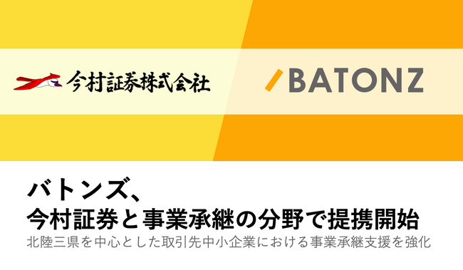 M&A総合支援プラットフォーム「BATONZ(バトンズ)」を運営する株式会社バトンズ(本社:東京都中央区、代表取締役CEO:神瀬 悠一、以下バトンズ)は、今村証券株式会社(本社:石川県金沢市、取締役社長:今村 直喜、以下今村証券)と中小企業における第三者承継・M&Aを支援するための提携を開始したことをお知らせします。